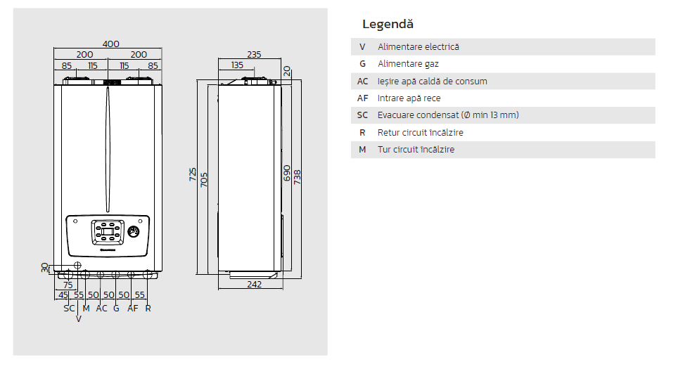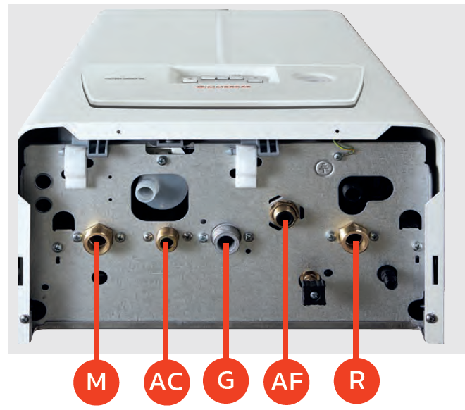 RACORDURI DE TIP DIN PENTRU O INSTALARE UȘOARĂ ȘI RAPIDĂ Datorită dispunerii tip DIN a racordurilor, VICTRIX OMNIA 26 V2 este ușor de instalat în cazul înlocuirii unor modele învechite, uzate și neeconomice. Configurația DIN se caracterizează prin poziționarea centrală a racordului de gaz „G”, între racordurile de tur și retur ale instalației de încălzire (M-R) și cele ale apei de consum (AF - racordul la rețeaua de apă și AC – ieșire apă caldă de consum).