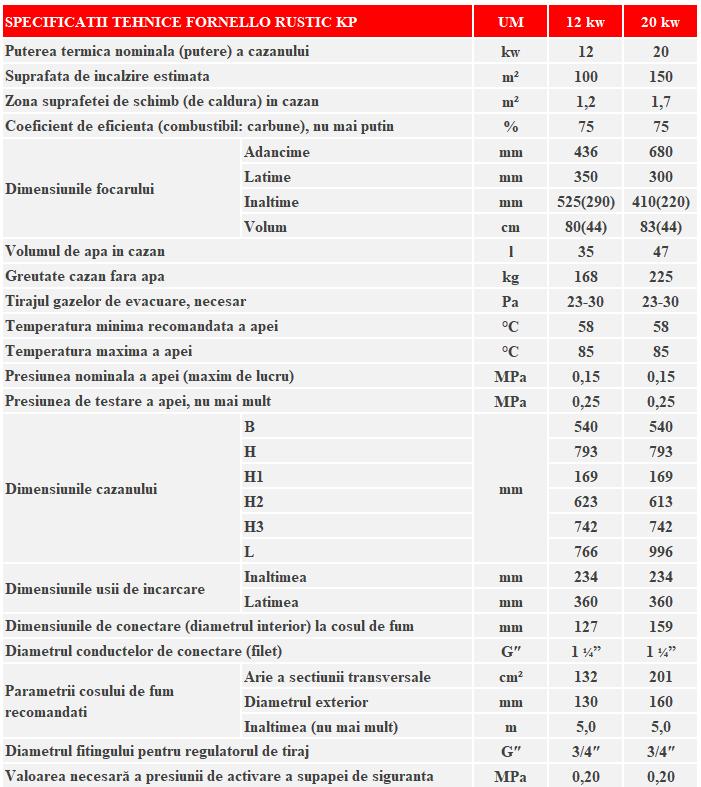 Principalele caracteristici tehnice ale cazanelor Fornello Rustic KP sunt prezentate mai jos: