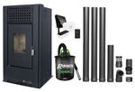 Pachet complet pentru incalzire cu control de la distanta format din Semineu (Soba) pe Peleti cu aer cald Magnesia 9 KW, culoare Black, termostat ambiental Salus IT 500, aspirator de cenusa si kit de evacuare...