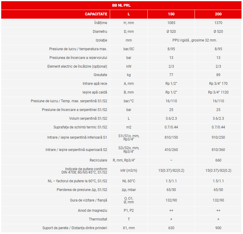 Boiler termoelectric Sunsystem BB NL2 150 PRL 3KW cu doua serpentine, 150 litri, putere serpentina 15 kw, putere electrica 3 KW, serpentine pe partea dreapta, reglaj extern al temperaturii, izolatie termica