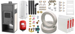 Pachet incalzire si apa calda pentru 2 camere Termosemineu pe lemne, brichete si carbune Fornello Roma E, 22 kW, 49x45x103 cm, teava, boiler termoelectric 100l, vas expansiune, pompa circulatie, kit evacuare, calorifere si fitinguri