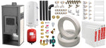 Pachet incalzire si apa calda pentru 3 camere Termosemineu pe lemne, brichete si carbune Fornello Roma E, Ivory, 22 kW, 49x45x103 cm, teava, boiler termoelectric 100l, vas expansiune, pompa circulatie, kit evacuare, calorifere si fitingu