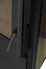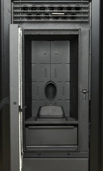 Soba tip semineu este confectionata din otel, carcasa este din tabla vopsita in camp electrostatic, focarul este din fonta, iar usa prezinta sticla termica cu suprafata mare.