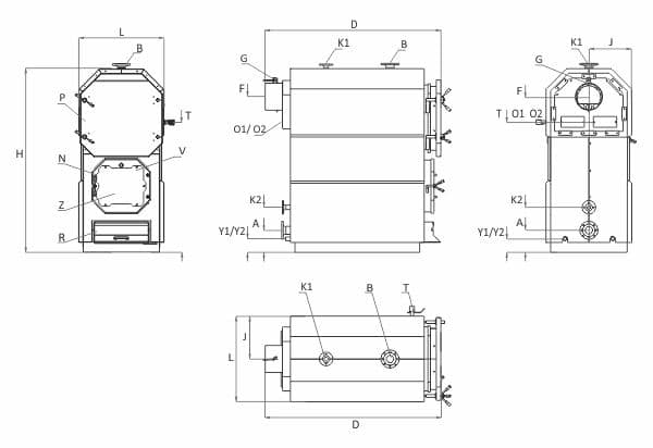 Trei drumuri de fum. Pentru un schimb de căldură mai bun tuburi de fum trec prin manta de apă.