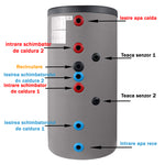 -O serpentina se monteaza la panoul solar, cea de a doua serpentina se monteaza fie pentru aport la incalzire, fie la o alta sursa aditionala pentru a incalzi apa menajera din boiler