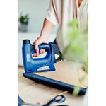 Acest pistol de capsare mobil cu baterii, cu aplicații multiple, este ideal pentru lucrările de acasă și de bricolaj care necesită mai multă libertate de mișcare. Performanța ridicată a bateriei cu un acumulator Li-Ion de 7,2V și reîncărcarea rapidă sporesc eficiența muncii, în timp ce piesele robuste și construcția de calitate sporesc durata de viață. Perfectă pentru utilizarea zilnică și pentru sarcini precum tapițeria mobilierului, lucrări textile sau fixarea covoarelor, a pielii sau a materialelor mai subțiri din lemn. Dispune de un nas de siguranță la îndemână care previne declanșarea accidentală și de un indicator de capse transparent pentru o reîncărcare eficientă.