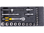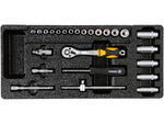DULAP SCULE VOREL ECHIPAT, 177 PIESE Dulap de scule echipat VOREL. Are 6 sertare echipate cu 12 module din plastic. Dulapul de service conține 177 de piese. Profil din tablă de oțel. Încuietoare cu cheie...