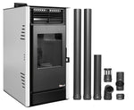 Pachet Semineu pe peleti cu aer cald Fiama Fuoco 8 kw, aprindere electrica, tiraj fortat, wifi, focar din fonta, recomandat pentru 75 mp, Alb, Kit evacuare 2.5
