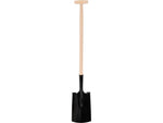 Cazma din oțel protejata împotriva coroziunii de un strat de lac negru. Montata pe o coada din lemn cu mâner în T.