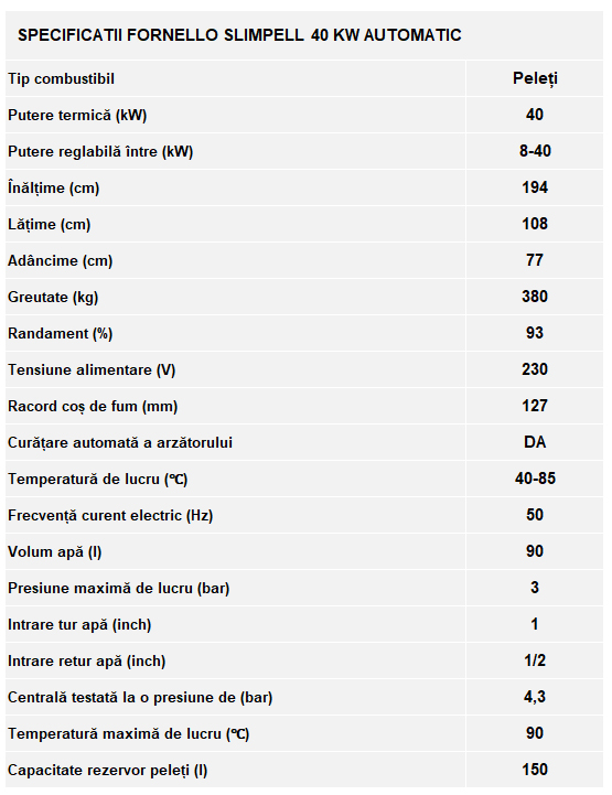 Centrala pe peleti Fornello Slimpel Automatic 40 kw, arzator inox, sistem curatare automata arzator si schimbator de caldura, pompa de circulatie, tiraj fortat , buncar 150 litri, pompa electronica Grundfos