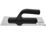 Gletiera de dimensiunea 270x125 mm din oțel inoxidabil cu dinți de 6 mm. Mâner confortabil și ușor din plastic. Esențiala atunci când aplicați adezivi, tencuieli și grunduri