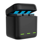 Încărcătorul TELESIN pentru încărcarea bateriilor camerelor din seria GoPro Hero 9, 10, 11 și 12 este conceput pentru cei care au nevoie ca dispozitivele lor să fie pregătite în orice moment. Nu numai că vă permite să încărcați instantaneu cele trei baterii, dar vă permite și să le depozitați în siguranță împreună cu cardurile de memorie. Kitul include, de asemenea, 3 baterii reîncărcabile cu o capacitate de 1750 mAh fiecare.