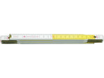 Metru de tamplarie din lemn de fag, vopsit în alb și galben, protejat împotriva efectelor umidității și radiațiilor UV. Fabricat în clasa a III-a de precizie.