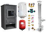 Pachet Termosemineu pe lemne, brichete si carbune Fornello B2E, 14 kW, 46x45x91 cm, cos inox, boiler termoelectric 80l, vas expansiune, pompa circulatie si kit montaj