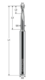 Acest model de freze cu doua caneluri sunt ideale atunci cand finisarea suprafetelor este importanta. Sunt de obicei utilizate pentru finisarea buzunarelor sau efectuarea de santuri usoare. De asemenea pot fi utilizate in aplicatii unde sunt necesare diametre mici ale varfurilor, deoarece frezele cu doua caneluri sunt mai rezistente fata de cele cu o singura canelura. Puteti gasi in portofoliul nostru o gama variata de unelte de frezare, fabricate din micro carburi metalice, cu o durata mare de viata, disponibile cu diametre variate ale varfurilor sau de prindere, pentru aplicatii uzuale sau cu geometrii speciale.