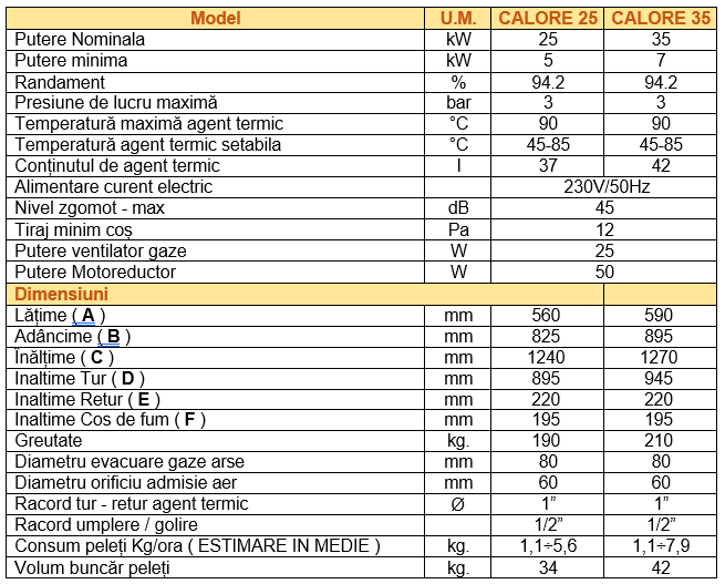 • Rezervor peleți: capacitate variabilă, în funcție de model