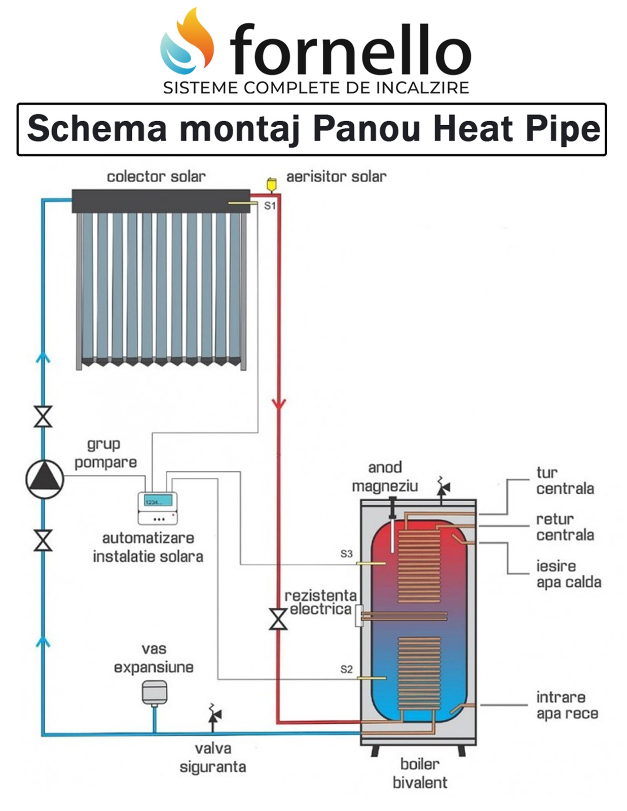 Pachet sistem solar presurizat, Panou Fornello 20 Tuburi Heat Pipe, Boiler Fornello Optima EV 6/4 S2, 160 Litri, Controller, Vas expansiune, Grup pompare, Aerisitor, Antigel