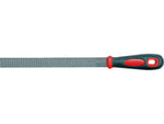 Raspila cu profil plat, cu dinți speciali pentru prelucrarea lemnului, cu mâner din plastic.