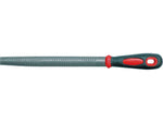 Raspila semirotunda, cu dinți speciali pentru prelucrarea lemnului, cu mâner din plastic.