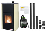 Termosemineu pe peleti Fiama Confort 18 kw, complet echipat pentru incalzire, pompa, vas expansiune, automatizare, buncar peleti 15 kg, tiraj fortat, culoare Crem, aprindere automata, pana la 120 mp