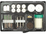 Un set de 17 accesorii abrazive compatinile masini de finisat. Accesoriile permit prelucrarea precisă a pieselor mici. Compatibile cu polizoare cu un orificiu de 3,2 mm.