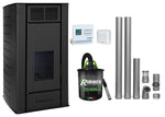 Pachet Termosemineu centrala pe peleti Fornello SERENA W25, 25 kw, culoare Black, complet echipat cu kit evacuare 2.5 ml, Termostat Radio Comanda Computherm Q3 RF, Aspirator Cenusa, suprafata incalzita pana la 150 mp