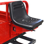 Remorca pentru motocultor are un scaun confortabil, dotat cu o cutie pentru depozitat sculele, suspensie pe foi de arc si roti mari pneumatice, 5.00-12.